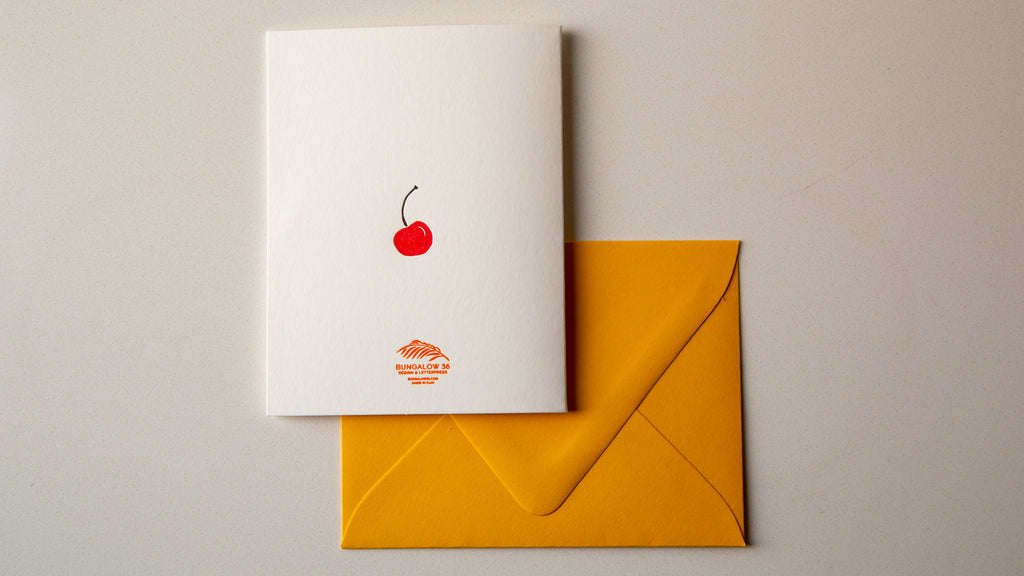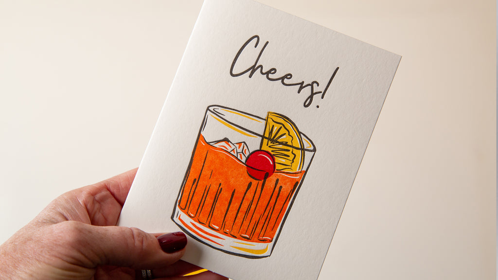 This card is hand illustrated and letterpress printed with lots of love on natural white 100% cotton paper. This cards was drawn in a bar on a rainy winter day. It was inspired by the Negroni but some want to say an old Fashion. It's Perfect for any celebration and a unique way to say "Cheers". This card is printed with four colors and is run through the press four times. Available as a single card or a box set of six folded notes. A2 (5.5x4.25)