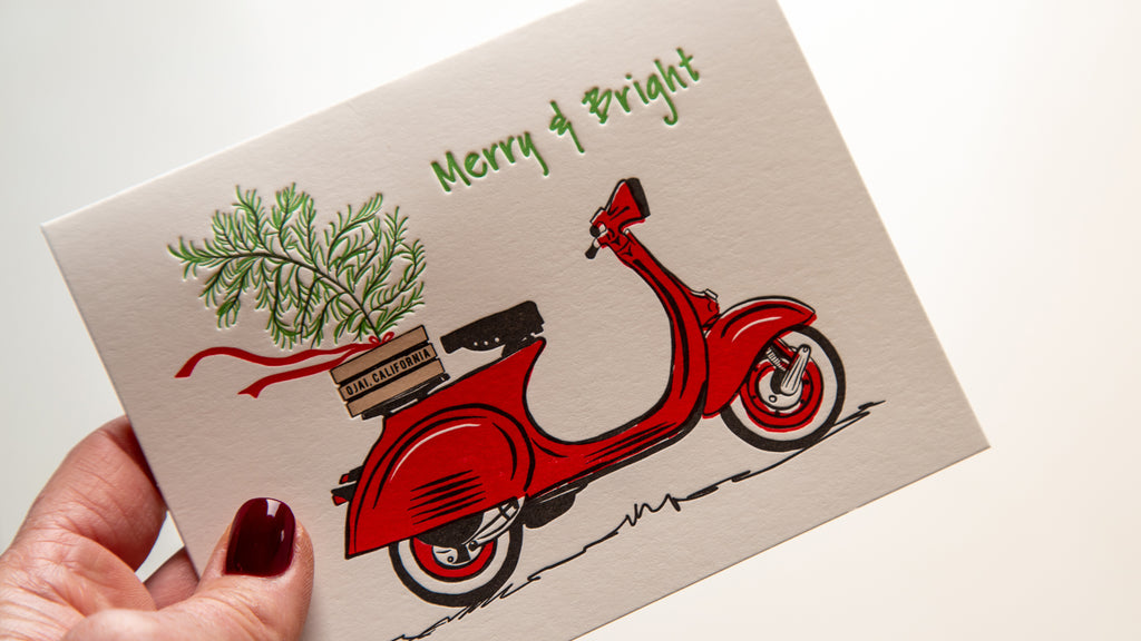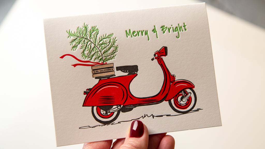 This card is hand illustrated and letterpress printed with lots of love on natural white 100% cotton paper. Send a special Holiday cards to your Vespa loving friends. This card is printed with five colors and is run through the press four times. Available as a single card or a box set of six folded notes. A2 (5.5x4.25)