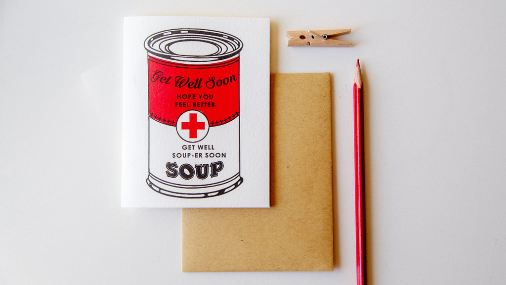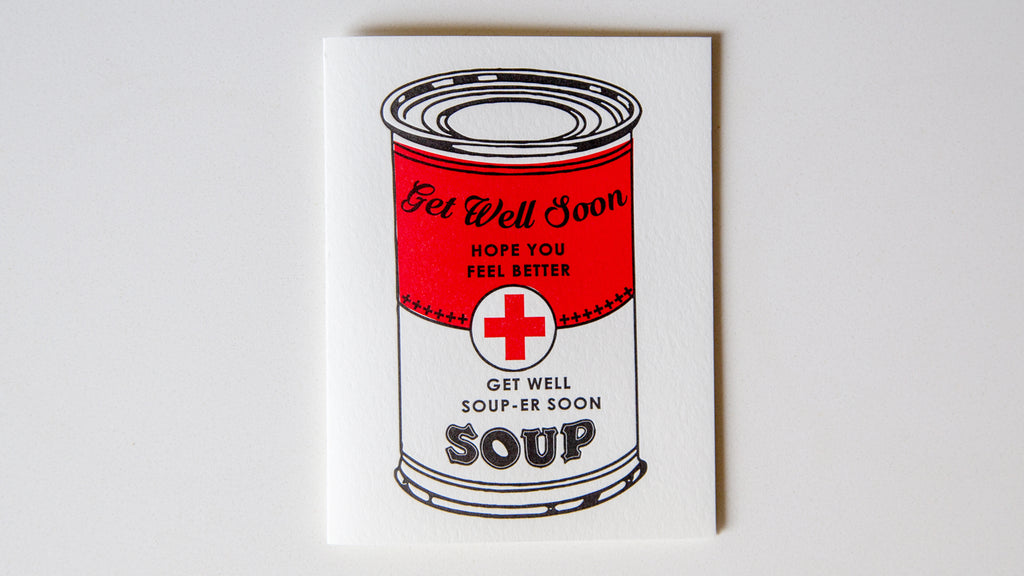 This card is hand illustrated and letterpress printed with lots of love on natural white 100% cotton paper. Inspired by Andy Warhol. Blank inside + with bright red envelope with. Available as a single card or a box set of 6 folded notes. A2 (5.5x4.25) #andywarhol #soup #getwellsoon